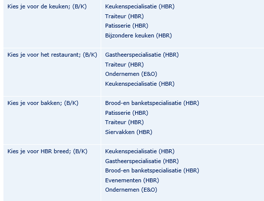 In de eerste en tweede klas staan er 6 uur per week praktijkvakken op het rooster. In de derde klas zijn dat er zelfs dertien en wordt er een examen afgenomen. In klas vier maak je de keuze; koken, serveren, bakken of horeca -breed en ga je veertien uur aan je keuzedelen werken.