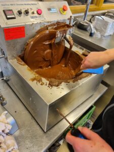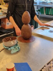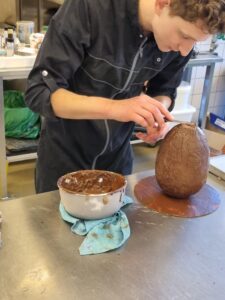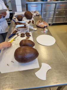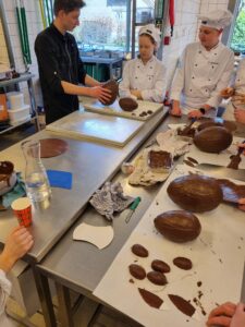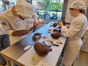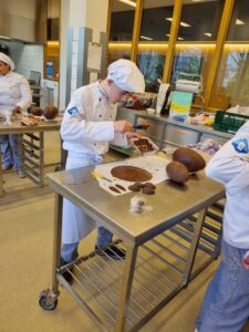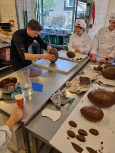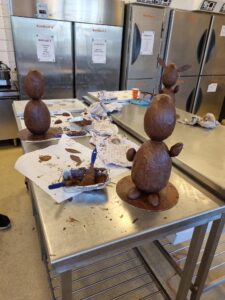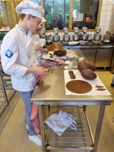 Onder leiding van P van der Molen hebben de enthousiaste studenten prachtige grote chocoladehazen gemaakt.