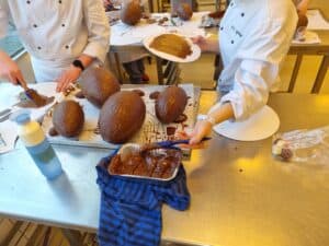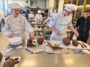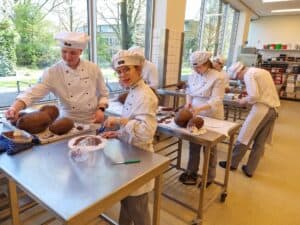 Onder leiding van P van der Molen hebben de enthousiaste studenten prachtige grote chocoladehazen gemaakt.
