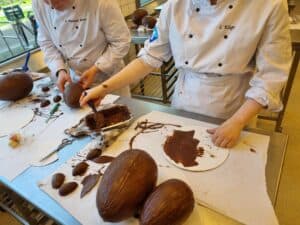 Met diverse technieken werden een paar chocolade eierschalen een prachtig kunstwerkje voor de paasdagen