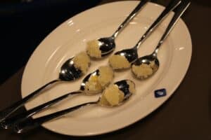 Er wordt begonnen met een Kir Royal die alcoholvrij is, dat is een combinatie van mousserende witte wijn en crème de cassis. Nog even een punt van aandacht om goed te kunnen proeven: